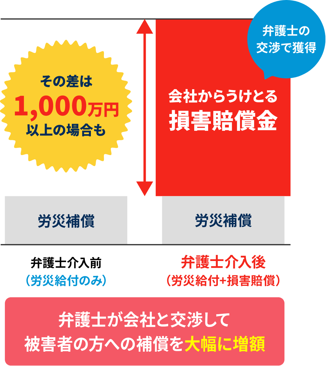 労災保険だけでは、実際にかかる治療費や生活費のすべてをまかなえないことが少なくありません。当事務所では、労災保険の給付申請に加え、会社側の安全配慮義務違反などが認められる場合には、損害賠償請求もあわせて行います。図のとおり、弁護士が介入することで、労災給付(約300万円)に加えて損害賠償金として1,000万円以上増額されるケースも多くあります。